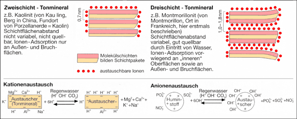 Tonminerale besitzen große spezifische Oberflächen, haben die Fähigkeit der reversiblen An- und Einlagerung von Wassermolekülen, sind in der Lage zu quellen und zu schrumpfen, sind der Grund für die Plastizität der Tone und verfügen über die Eigenschaft, Ionen in austauschbarer Form zu adsorbieren. Gemeinsam mit der organischen Substanz bedingen sie die Fähigkeit der Böden zur Wasserbindung, Gefügebildung und Nährstoffadsorption. Tonminerale werden eingeteilt in Zweischicht- und Dreischichtminerale, je nachdem, ob die Oktaederschicht im Kristallgitter mit einer oder zwei Tetraederschicht(en) verbunden ist. Zu den Zweischicht-Tonmineralen gehören beispielsweise Kaolinit und Halloysit, zu den Dreischicht-Tonmineralen zählen u.a. Illit und Montmorillonit.