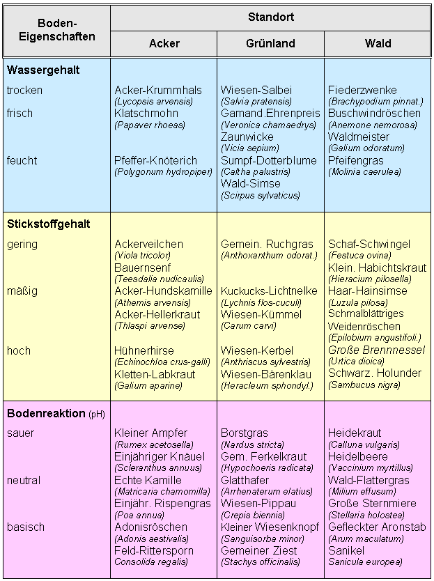 Bodeneigenschaften Zeiger- bzw. Weiserpflanzen als Bioindikatoren für den Bodenzustand ausgewiesen werden. Das Vorkommen