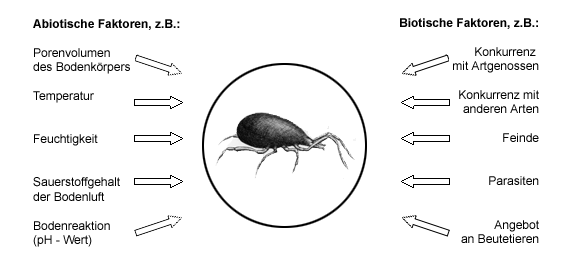 Bodenkrümel, Hohlräume und Gänge verschiedener Größe und Struktur differenzieren den Lebensraum Boden zunächst einmal in zahlreiche Mikrosphären und Nischen mit unterschiedlichen physikalisch-chemischen Lebensbedingungen. Mit zunehmender Bodentiefe sind diese Bedingungen im Wesentlichen durch Sauerstoffmangel, Lichtmangel und hohe Bodenfeuchtigkeit gekennzeichnet. Für die Besiedlung der Pedosphäre als Lebensraum spielt die Raumstruktur des Bodenkörpers eine große Rolle, insbesondere die Größe und Häufigkeit der Hohlräume bzw. Bodenporen , die mit Luft und bzw. oder Wasser gefüllt sind. Der gesamte Bodenkörper wird zwischen den festen Bodenkrümeln von einem labyrinthartigen Porensystem durchzogen. Der Durchmesser der Poren nimmt in der Regel mit zunehmender Bodentiefe ab und reduziert sich von wenigen Millimetern auf Bruchteile davon. Parallel dazu nimmt der Feuchtigkeitsgehalt und Kapillarwasseranteil zu. Ein durchschnittlich entwickelter Bodenkörper besteht etwa zur Hälfte aus fester Substanz, die sich zu Bodenkrümeln zusammenlagert, und zur Hälfte aus Hohlräumen bzw. Bodenporen. Ungefähr ein Drittel dieser Poren ist großvolumig und mit Luft gefüllt und zwei Drittel sind kapillarwasserführend. (s. Porenvolumen) Bodenlebewesen besiedeln die Bodenporen und Oberflächen der Bodenpartikel. Sie können sich über das Porensystem weiter ausbreiten und dadurch das Porensystem auch verändern. Eine wichtige Rolle spielt dabei das Wurzelwachstum der Pflanzen, das den Boden auflockert und neue Siedlungsräume schafft. Aufgrund der geringen Porengröße sind die meisten Bodenlebewesen sehr klein und an die spezifischen Verhältnisse - Lichtarmut, Sauerstoffmangel und hohe Feuchtigkeit - besonders angepasst. Ihr Verbreitungsschwerpunkt liegt im organisch angereicherten Oberboden. Die Verteilung der verschiedenen Organismenarten im Boden ist abhängig vom Durchmesser der Bodenporen. So können Feinporen mit einem Durchmesser < 0,2 µm nicht besiedelt werden. Aufgrund ihrer geringen Größe und ihrer besonderen Stoffwechseleigenschaften können alle Bakterienarten die Mittelporen (Durchmesser 0,2 - 50 µm ) bewohnen, auch wenn die Poren längerfristig wassergefüllt sind. Steht ausreichend Sauerstoff zu Verfügung, können die Mittelporen auch von vielen Pilzarten, Algen, Einzellern (Protozoen) und Wurzeln besiedelt werden. Die mehrzelligen Bodentierarten dagegen sind so groß, dass sie nur die Grobporen (Durchmesser > 50 µm) bewohnen können, die in durchlässigen Böden in der Regel nicht mit Wasser gefüllt sind. Neben diesen bodenphysikalischen Strukturmerkmalen wirken sich weitere spezifische Eigenschaften des Bodenkörpers wie z.B. Bodenklima, Mineralsalzgehalt und Bodenreaktion (s. Bodeneigenschaften) auf die Lebensbedingungen im Boden aus. Die Gesamtheit der Einflüsse, die von der unbelebten Umwelt auf die Lebewesen (im Boden) einwirken, werden als abiotische Faktoren bezeichnet. Darüber hinaus werden die Lebensbedingungen im Boden durch biotische Faktoren differenziert, d.h. durch Einflüsse, die von den Lebewesen selbst ausgehen. Dazu gehören z.B. Konkurrenzwirkungen zwischen Artgenossen und zwischen Vertretern verschiedener Arten, Räuber-Beute-Beziehungen, symbiotische und parasitische Lebensformen und Nahrungsketten bzw. -netze (s. Interaktionen und Nahrungskette und Nahrungsnetze im Boden). Diese wirken sich wiederum modifizierend auf die abiotischen Faktoren aus. Die Qualität der abiotischen und biotischen Faktoren des Lebensraumes beeinflusst die Zusammensetzung der Arten in einer Lebensgemeinschaft und ihre jeweilige Individuendichte. Abiotische und biotische Faktoren, die an einem Standort wirksam sind, werden daher auch als Standortfaktoren bezeichnet und je nach Ursprung differenziert in natürliche Standortfaktoren und anthropogene, d.h. durch menschliche Tätigkeit bedingte Standortfaktoren (z.B. Eintrag von Luftschadstoffen, Düngung, Bodennutzung).
