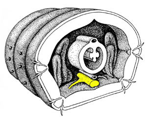 Abb.1: Lage des Bauchmarks im Regenwurmkörper (gelb; im Längsschnitt)