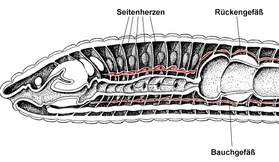 Das Blut bewegt sich im Regenwurmkörper in einem geschlossenen Kreislaufsystem, welches aus zwei Hauptgefäßen, 5 paarigen Seitenherzen, Seitenadern und feinen Haargefäßen (= Kapillaren) besteht (s. Abb.).