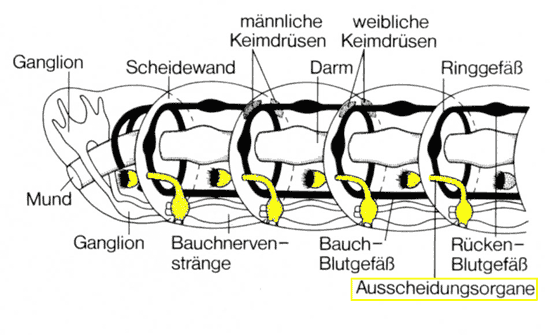 Lage der Ausscheidungsorgane im Regenwurmkörper im Längsschnitt