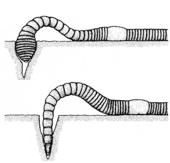 Beim Eindringen in den Boden und bei der Neuanlage von Gängen und Röhren wird das stark muskulöse und zugespitzte Vorderende als Keil benutzt (s. Abb. 2). „Der Vortrieb des Körpers erfolgt wie an der Oberfläche durch abwechselnde Betätigung der beiden Muskellagen. Zum Überwinden des Bodenwiderstandes dient der hydrostatische Druck der Leibeshöhlenflüssigkeit auf die Körperwand“ (GRAFF 1983, S. 39). Durch kräftige Kontraktion der Längsmuskulatur verkürzen und verdicken sich die vorderen Segmente und erweitern den Hohlraum an der Bodenoberfläche. Dabei wird der Wurmkörper durch eine vom Vorder- zum Hinterende laufende, kontraktionsbedingte Verkürzungs- und Verdickungswelle der nachfolgenden Segmente nachgezogen. Durch wiederholtes Vorstrecken und nachfolgende Kontraktionswelle wird der Bodengang gebohrt, vertieft und erweitert (vgl. DUNGER 1964, S. 65 ff. und BRAUNS 1968, S. 312 ff.). So gräbt sich der Regenwurm immer tiefer in den Boden ein und legt im Laufe der Zeit zahlreiche Gänge und Wohnröhren an. Durch seine Borsten, mit denen er sich im Untergrund verankert, kann er in seinen engen Röhren auf – und absteigen.