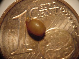 Die Kokons werden in den oberen Bodenzonen abgelegt und zum Teil noch mit einer Schutzhülle aus Regenwurmkot versehen. Größe, Form und Farbe der Kokons sind bei den verschiedenen Regenwurmarten unterschiedlich ausgeprägt. So variiert die Farbe zwischen Gelb- und Brauntönen (s. MEINHARDT 1986, S. 44 ff.). Im Laufe der Entwicklung werden die aber Kokons transparenter, so dass man die sich entwickelnden Tiere sehen kann. Die Länge der Kokons beträgt je nach Art etwa 2-7 mm (s. Abb.4). Beim Tauwurm (Lumbricus terrestris) ist der Kokon circa 6 mm lang und 4 mm dick, bei dem deutlich kleineren Mistwurm (Eisenia foetida) nur halb so groß.
