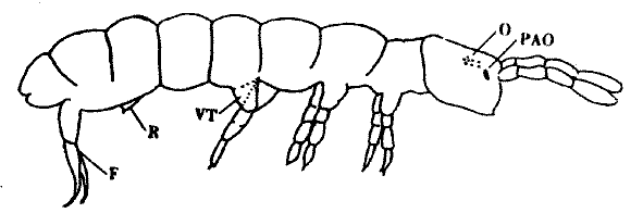 PAO= Postantennalorgan, O= Einzelaugen (Ommen), VT= Ventraltubus,