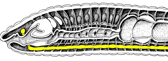 Abb.1: Lage des Bauchmarks im Regenwurmkörper (gelb; im Längsschnitt)