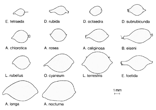 Die Kokons werden in den oberen Bodenzonen abgelegt und zum Teil noch mit einer Schutzhülle aus Regenwurmkot versehen. Größe, Form und Farbe der Kokons sind bei den verschiedenen Regenwurmarten unterschiedlich ausgeprägt. So variiert die Farbe zwischen Gelb- und Brauntönen (s. MEINHARDT 1986, S. 44 ff.). Im Laufe der Entwicklung werden die aber Kokons transparenter, so dass man die sich entwickelnden Tiere sehen kann. Die Länge der Kokons beträgt je nach Art etwa 2-7 mm (s. Abb.4). Beim Tauwurm (Lumbricus terrestris) ist der Kokon circa 6 mm lang und 4 mm dick, bei dem deutlich kleineren Mistwurm (Eisenia foetida) nur halb so groß.